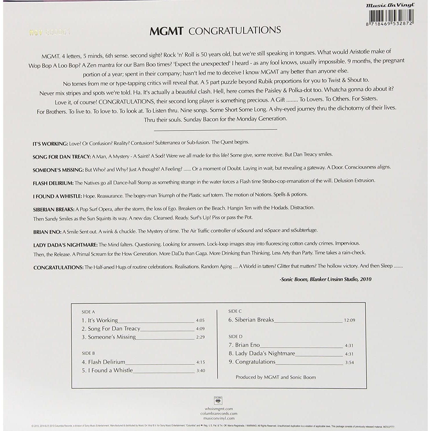 'Congratulations' is the second major label studio album by American psychedelic rock band MGMT. The album is a departure from the Synth Pop style that first brought the band acclaim on 'Oracular Spectacular', and features a more progressive, guitar-driven sound.
