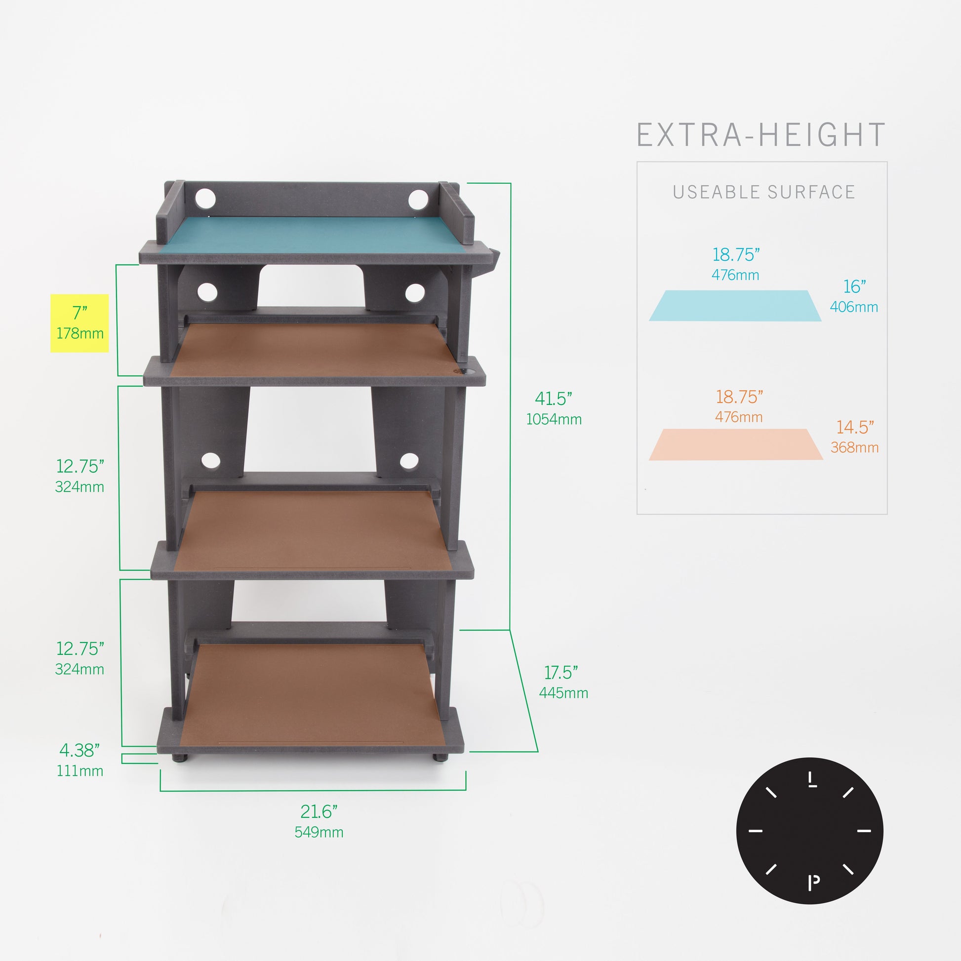 available in (2) heights: Standard âž?5" accessories shelf / Extra-Height âž?7" to accommodate most amplifiers